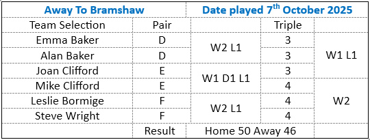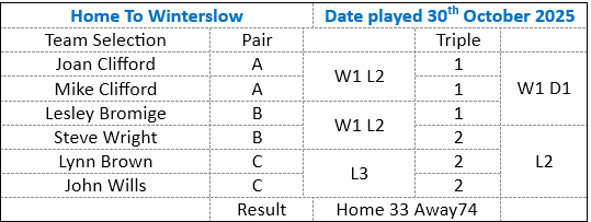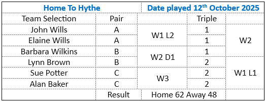Off we travelled to the northern parts of Hampshire. We beat Winterslow at home and hoped for an away win. Sad to say we were not successful this time. With more loses than wins & trying to gain 15 points going into the triples, it didn't happen. But the games were close but not close enough.